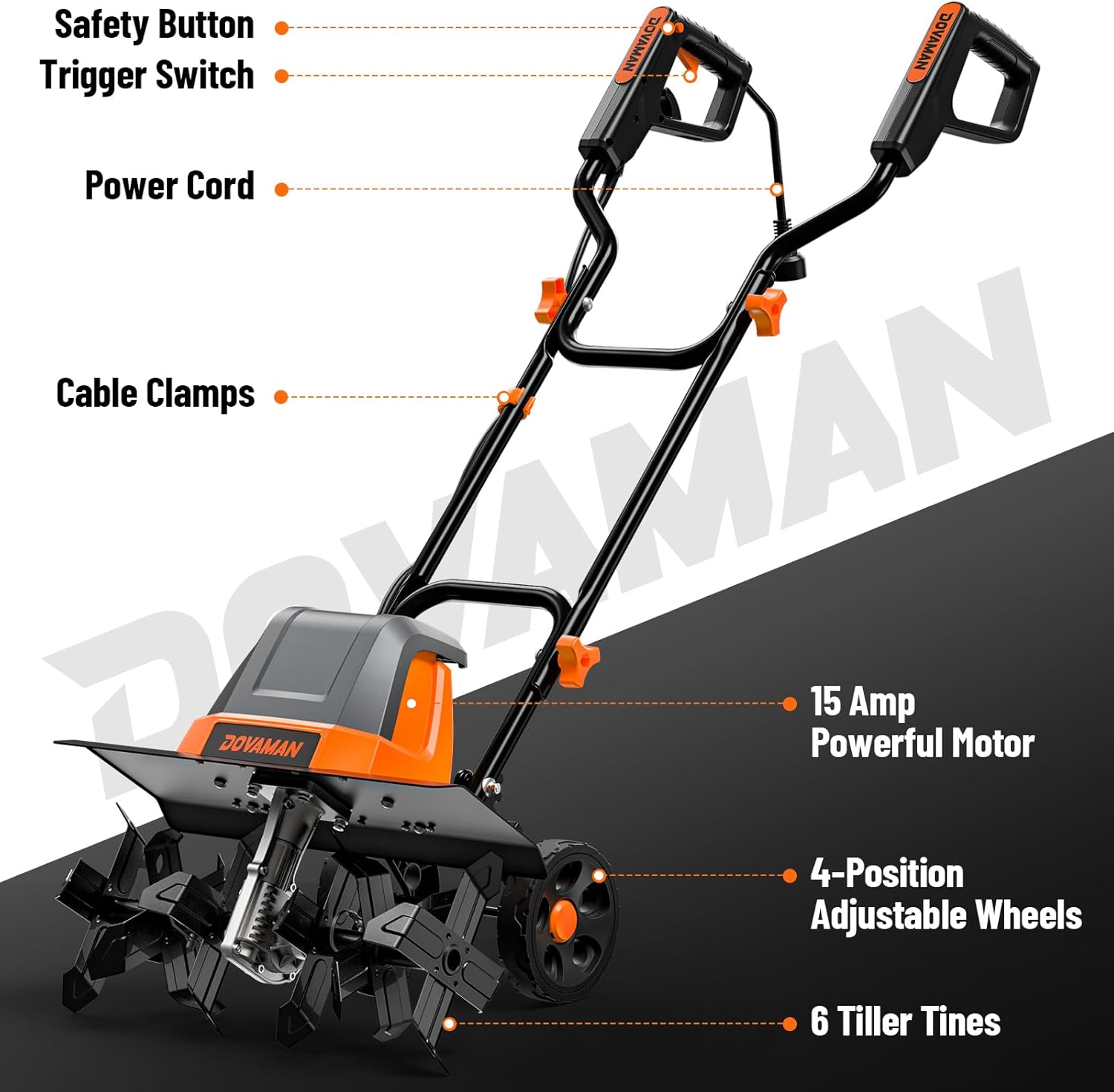 Figure 1: Labeled components of the DOVAMAN T03 Electric Garden Tiller, including the safety button, trigger switch, power cord, cable clamps, 15 Amp motor, 4-position adjustable wheels, and 6 tiller tines.